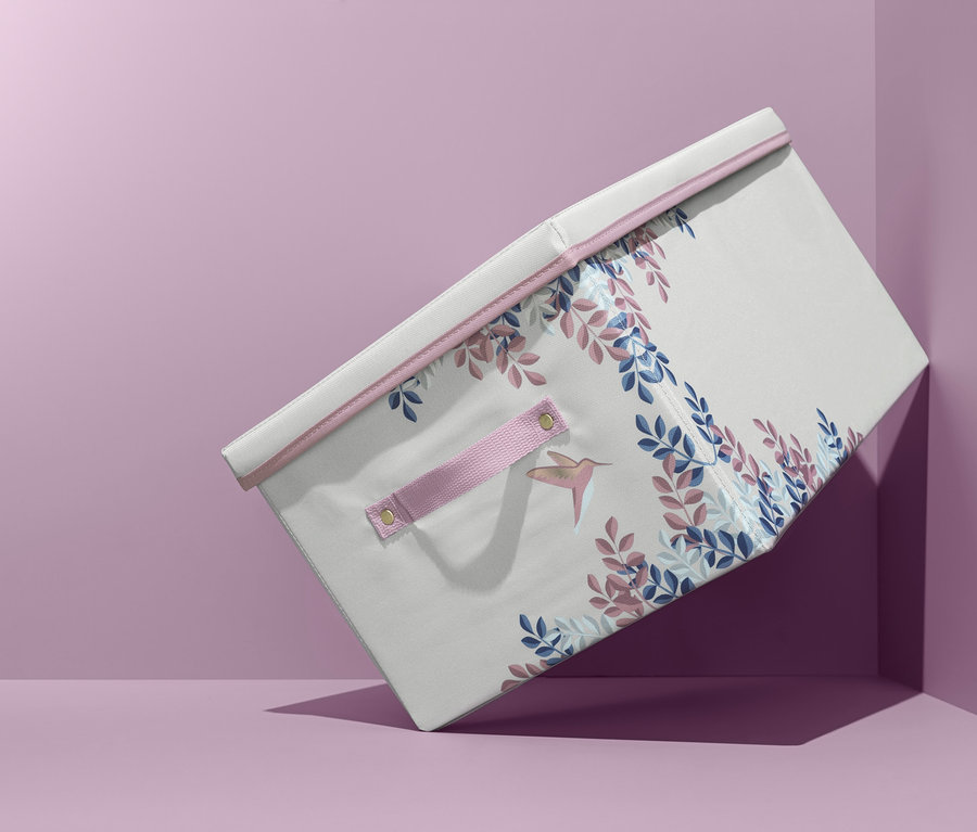 Úložný box je vybaven dvěma úchyty připevněnými pomocí nýtů zlaté barvy. Boční stěny a dno jsou zesílené. Dno se dá vyjmout a box se dá v případě potřeby prostorově úsporně složit.