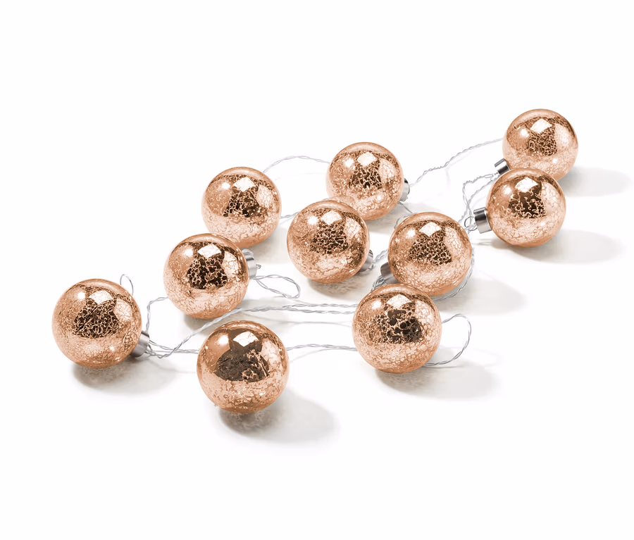 S tímto světelným řetězem s LED dodáte vánoční výzdobě slavnostní lesk: 10 skleněných koulí v dekorativním vzhledu selského zlata je opatřeno pevně zabudovanými LED, které vydávají teplé bílé světlo a doslova korunují každou slavnostní výzdobu!