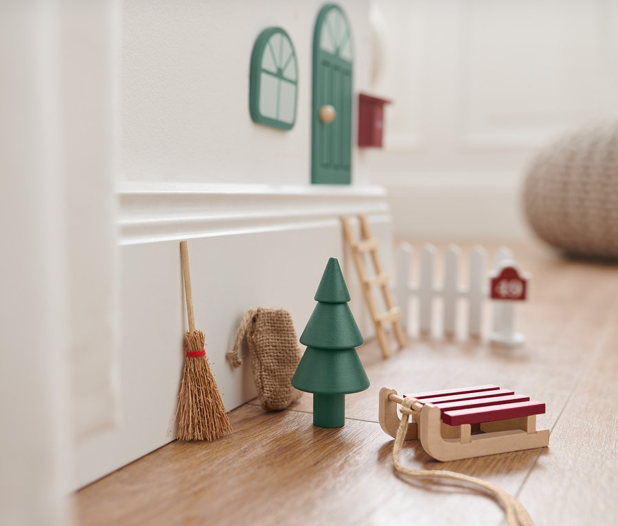 • Detailně propracované příslušenství v miniaturním formátu: sáňky, stromek, koště a jutový pytlík