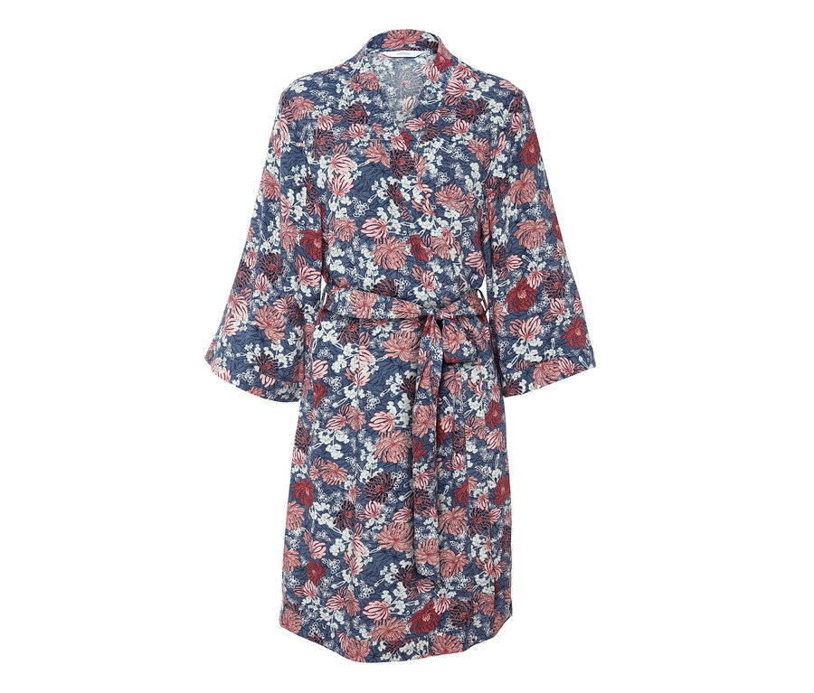 Tento župan v klasickém kimono stylu je ideální na příjemný začátek dne. Je vyrobený ze splývavé tkané viskózy příjemné na tělo. Kromě klasického pásku na zavazování je vybaven i šňůrkou na zavazování na vnitřní straně. Květinový potisk dodává županu jemný romantický akcent.