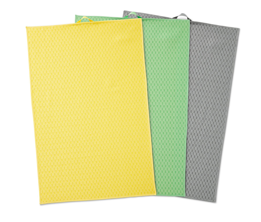 Všechny tři utěrky mají jednu stranu s vysokým vlasem na nerovné plochy a jednu jemně strukturovanou stranu na hladké plochy. Lze je použít i na zrcadla, obkladačky či okna – perfektně utírají do sucha a díky podílu mikrovlákna nepouštějí vlákna. Mikrovlákno navíc zajišťuje, že utěrky dlouho vydrží, dobře sají a rychle schnou.