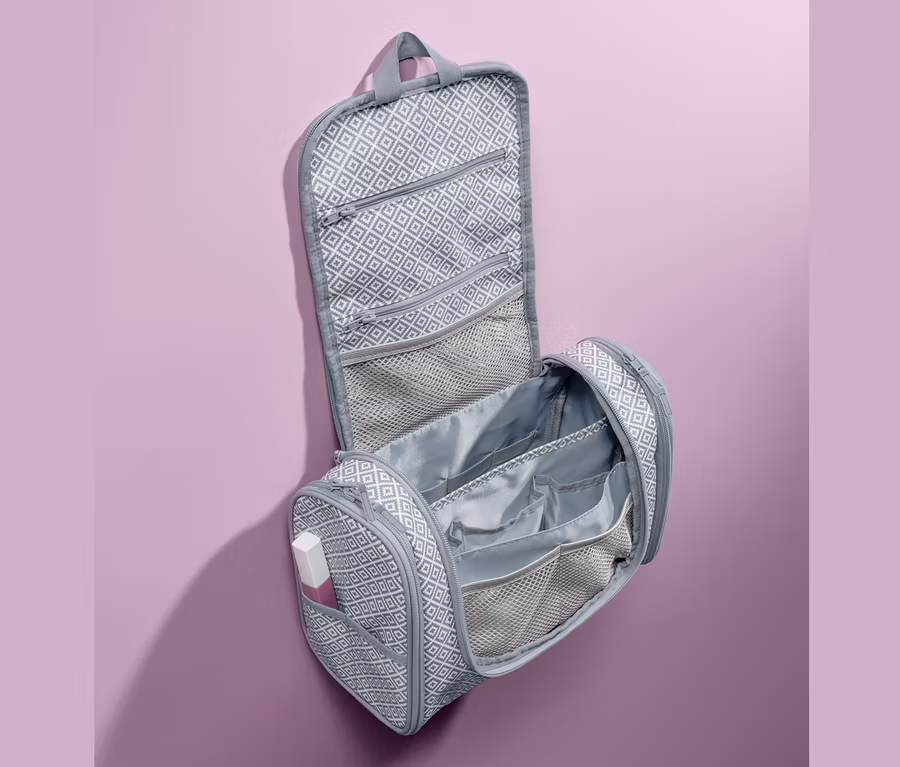 Ideální volba pro každého, kdo často nebo příležitostně cestuje: do této multifunkční kosmetické taštičky k pověšení lze do spousty přihrádek uložit nejdůležitější kosmetiku a vše, co by na cestách nemělo chybět. Taštička nabízí – kromě různých přihrádek uvnitř – pět kapes na zip: na každém boku na vnější straně po jedné kapse, jednu na klopě a dvě na vnitřní straně. Taštička je vyrobená z odolného svrchního materiálu, který lze otírat vlhkým hadříkem, a je vybavena uchem.