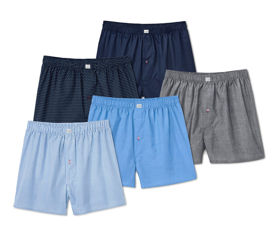 - 1x světle modrý vzor chambray, 1x námořnicky modrý vzor chambray, 1x světle modro-bílé proužky, 1x námořnická modrá, 1x námořnická modrá s bílým celopotiskem