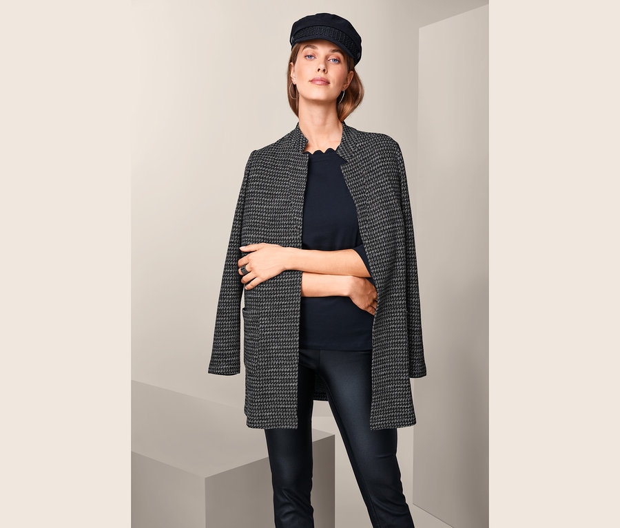 - Krátký kabátek s dekorativním kovovým štítkem na spodním lemu