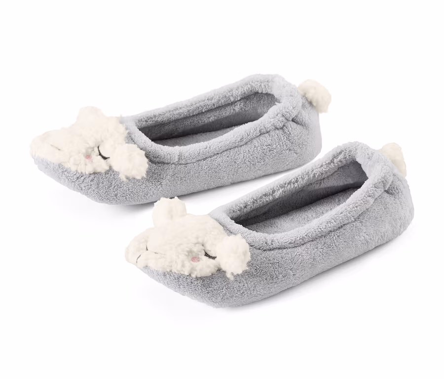 Studené nohy? To je z toho včerejšího dovádění na sněhu! S těmito domácími balerínami z měkkého plyše budete mít nohy krásně v teple. A navíc jsou opravdu hezké – díky 3D uším a ocásku na zadní straně vypadají nesmírně roztomile. Podrážka je vybavená protiskluzovými nopky, které zajišťují bezpečnou chůzi.