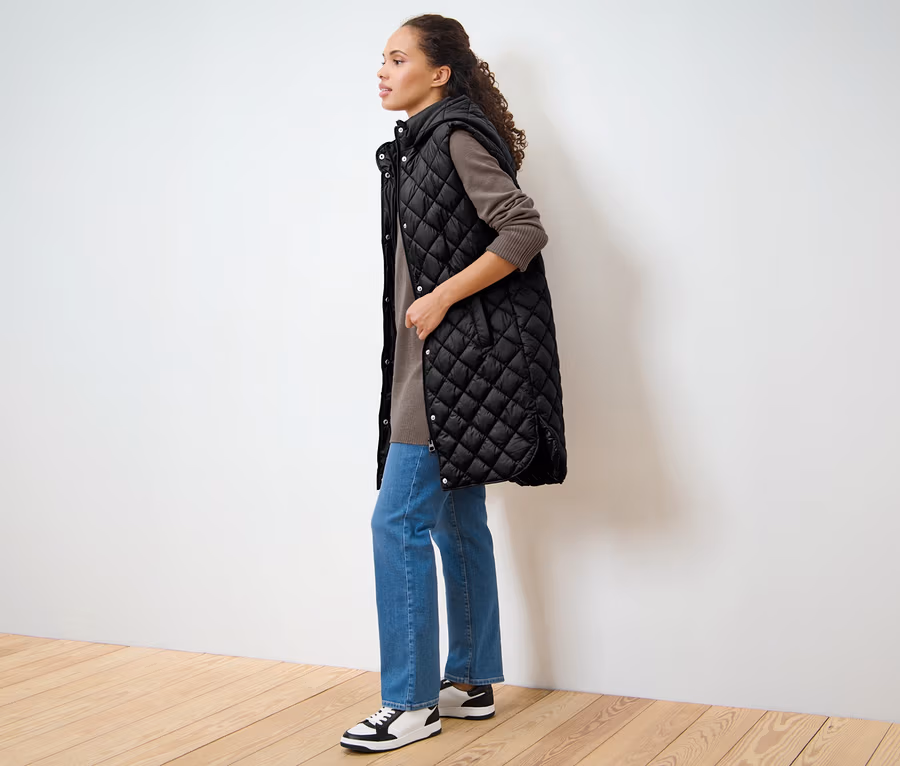 Dlouhá prošívaná vesta s kapucí