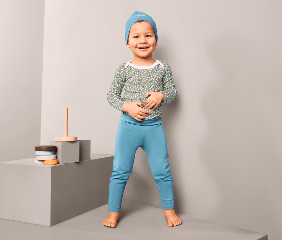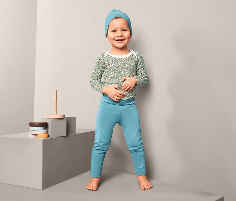 Tato sada obsahuje tři základní kousky oblečení, které nesmějí chybět v prádelníku miminek a batolat: body, kalhoty a čepičku. Všechny tři kousky oblečení jsou díky vysokému podílu bavlny z udržitelné produkce nádherně měkké a příjemné vůči citlivé dětské pokožce. Pohodlné kalhoty mají extra široký, elastický pas, takže porostou s dítětem. Body je vyrobené kompletně z biobavlny. Ve velikostech 50/56 a 62/68 má zavinovací formu, od velikosti 74/80 je navlékací. Čepička chrání hlavičku a uši před chladem a větrem a dotváří celkový vzhled.