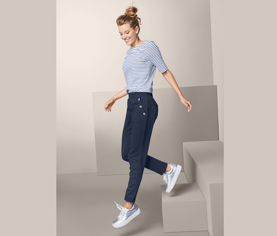 Tyto tepláky v délce po kotníky v nadčasové modré barvě jsou perfektní na volný čas a svým námořnickým vzhledem dodají každému outfitu krásný akcent. Jsou vyrobené z měkké, elastické interlokové pleteniny s biobavlnou, takže jsou za všech okolností příjemné na tělo. Díky obsahu elastanu dobře drží tvar a výborně sedí.
