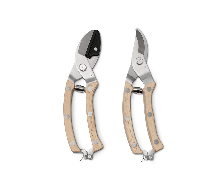 - Dvoučepelové nůžky: pro přesnou práci na všech rostlinách, např. na růžích, keřích