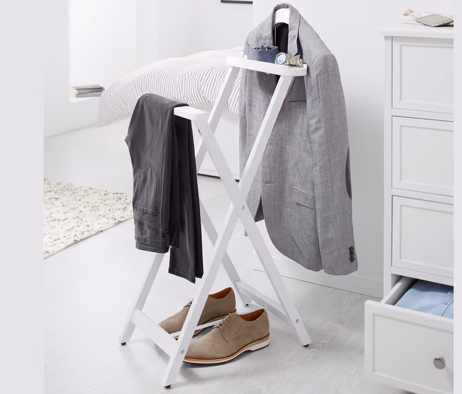 Němý sluha je vybaven jedním šatním ramínkem, ramínkem na kalhoty a typickou odkládací plochou na šperky a jiné doplňky, takže nabízí spoustu úložného prostoru. Konstrukce je vyrobená z eukalyptového dřeva s certifikací FSC® a je vybavena textilním páskem jako pojistkou proti přílišnému otevření. A když tento kousek nábytku právě nepotřebujete, můžete jej prostorově úsporně složit a uschovat – ale vzhledem k jeho praktičnosti tato situace nejspíš vůbec nenastane.