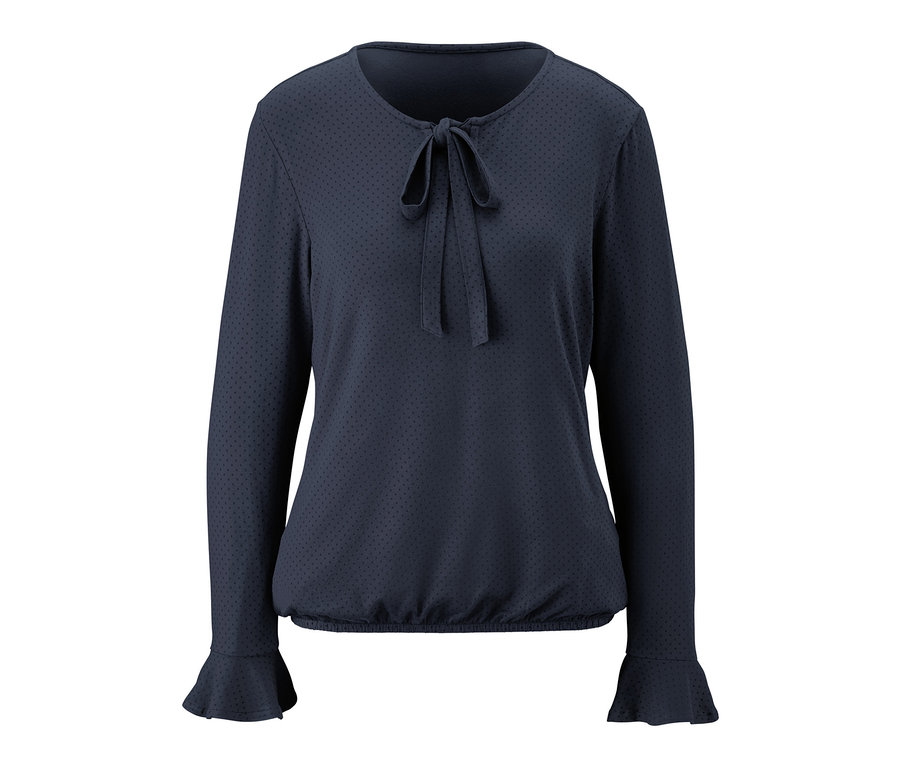 Vršky, jako je tohle halenkové tričko, se hodí jak do kanceláře, tak jako součást outfitů pro volný čas. Tričko je vyrobené z měkce splývavé směsi viskózy a elastanu, má kulatý výstřih s mašličkou k zavázání a díky elastickému dolnímu lemu skvěle padne. Díky elastanu je navíc tvarově stabilní, perfektně sedí a pohodlně se nosí. O nepřehlédnutelný dojem se postarají nakládané volánky na koncích rukávů, barevně sladěný drobný potisk a dekorativní kovová destička na dolním lemu.