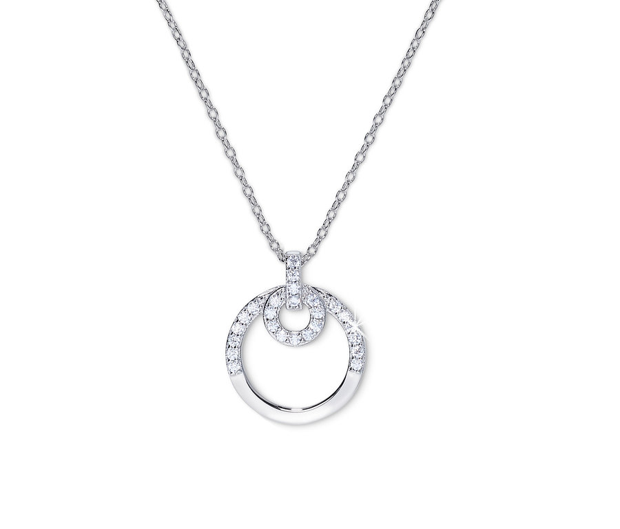 Dobrý design je jednoduchý, stačí jen vypustit vše zbytečné. Z tohoto pohledu je kruh dokonalým tvarem. Tento náhrdelník ze stříbra je zdoben kruhovým přívěskem, který ve svém nitru ukrývá další kroužek. Oba jsou osazeny třpytivými zirkony a tvoří tak harmonický celek – který se dá ale nádherně kombinovat i s jinými šperky. Náhrdelník je vybaven meziočkem, a dá se tak do délky upravit podle potřeby.