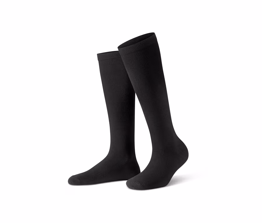 Oteklé nohy a pocit těžkých nohou – to jsou symptomy způsobené dlouhým stáním nebo sezením. Ale již brzy mohou patřit minulosti! Protože tyto módní kompresní podkolenky se stupňovanou kompresí (komprese v oblasti kotníku cca 14 mmHg) a extra plochými švy v oblasti prstů Vám mohou pomoci v náročných dnech. O obzvlášť příjemný pocit při nošení se postará materiálová směs biobavlny a vlákna LYCRA® ENERGIZE™. Podkolenky navíc díky obsahu elastanu dobře drží tvar a perfektně sedí.