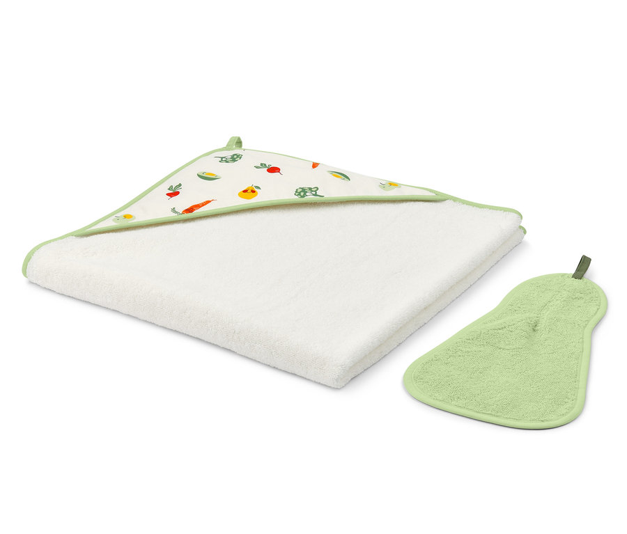 S touto sadou bude koupání dítěte nesmírně příjemné. Sada sestává z měkké žínky ve tvaru hrušky a z hebkého ručníku s kapucí, do kterého se může děťátko po koupeli zachumlat a být v teple. Žínka a ručník jsou vyrobené z čisté bavlny z udržitelné produkce a jsou opatřeny poutkem. Díky tomu je můžete mít v koupelně vždy krásně po ruce.
