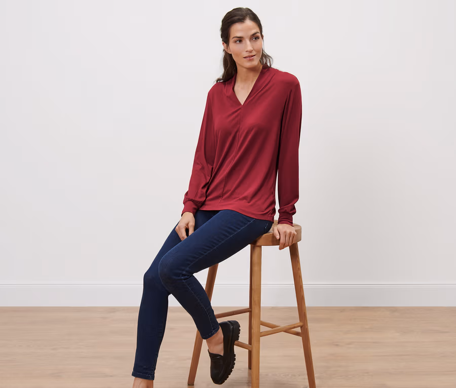 Triko s dlouhým rukávem a výstřihem do V, vínově červené