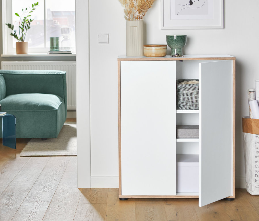 - 2x dvířka s otvíráním pomocí stisknutí určeného bodu, 2x výškově nastavitelná vkládací police