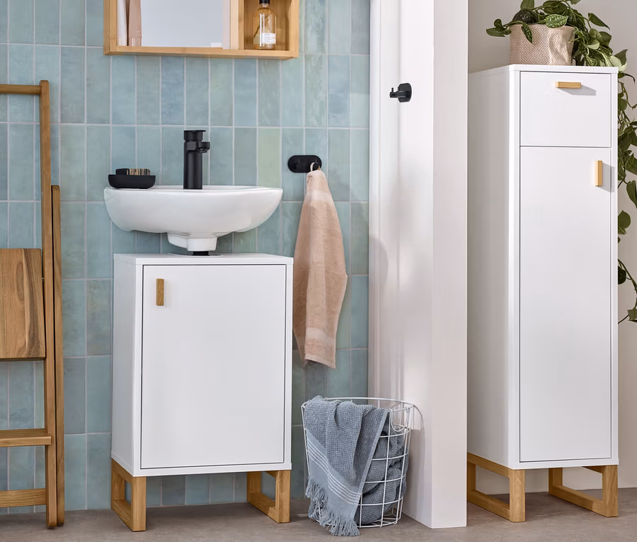 Odkládací koupelnová skříňka se zásuvkou a dvířky, úzká