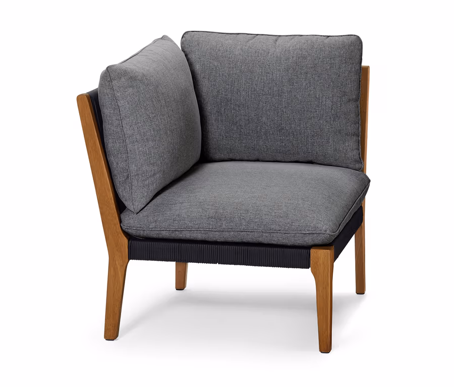 Tento rohový díl má rám z hliníku s povrchovou úpravou práškovou barvou a konstrukci z kvalitního lakovaného eukalyptového dřeva s certifikací FSC®. Opěradlo je potaženo kvalitním otevřeným textilním pletivem a spojuje moderní styl s nejlepší outdoorovou kvalitou. Tento kousek nábytku je navíc odolný proti UV záření i povětrnostním vlivům.