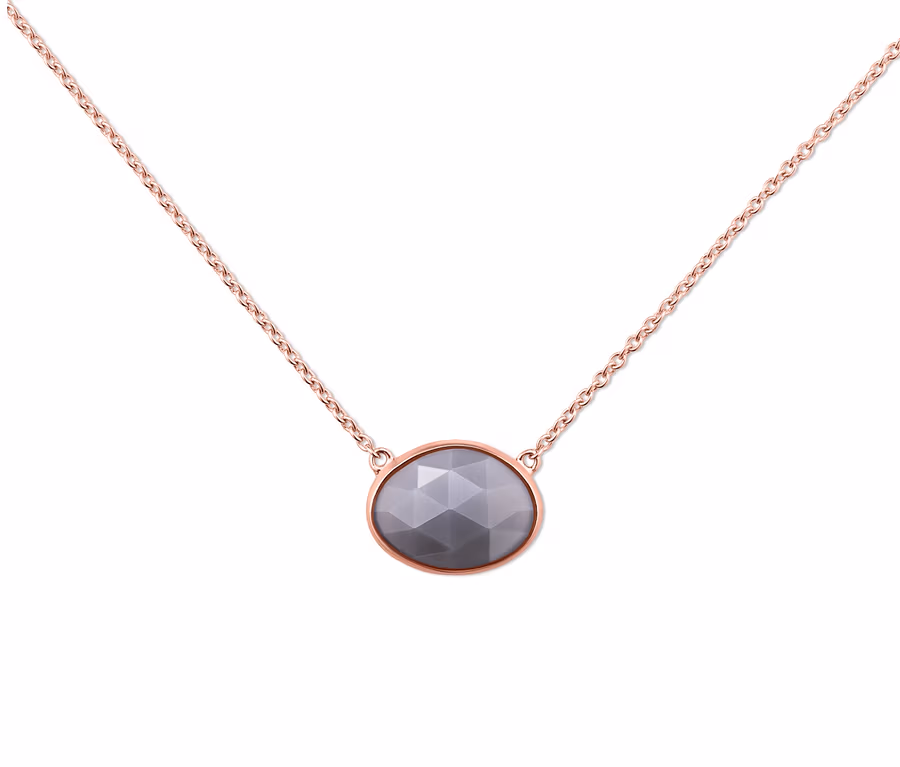 Tento stříbrný náhrdelník pozlacený růžovým zlatem je zdoben šedým chalcedonem v podobě přívěsku – vykouzlí elegantní dojem. Díky tomu, že se dá jeho délka nastavit od 42 do 45 centimetrů, lze tento náhrdelník nosit v delší i v o něco kratší variantě.