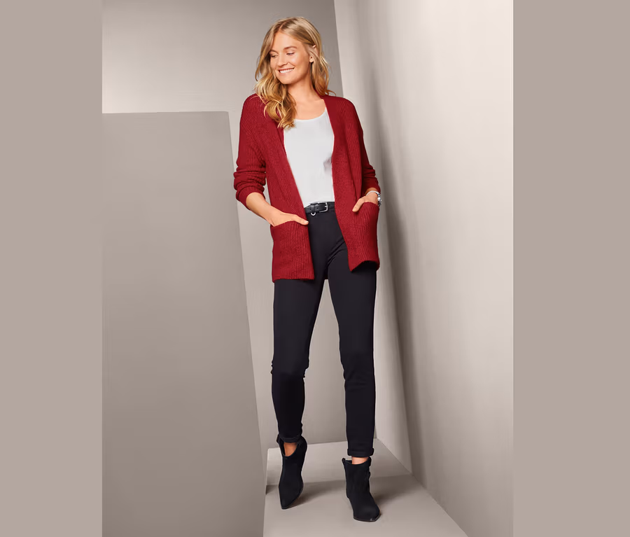 - Pohodlný, delší kabátek v klasickém kardiganovém stylu