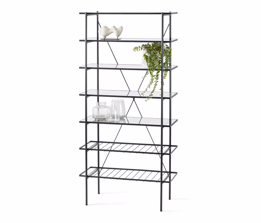- Vysoký, otevřený regál se 7 odkládacími policemi