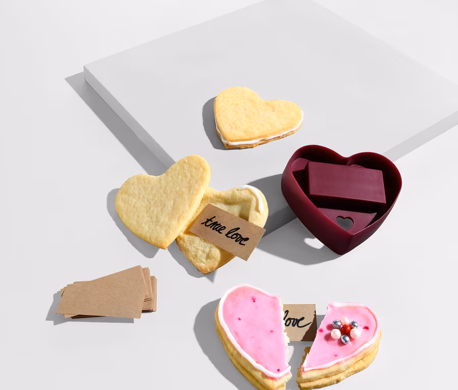 Zvláštností tohoto vykrajovátka na sušenky je, že vykrojí dvě strany sušenky ve tvaru srdce: korpus s otvorem a horní část. Do otvoru se dá zasunout lísteček s osobním vzkazem. Nyní stačí jen obě poloviny spojit čokoládou nebo cukrovou polevou a dát péci do trouby. Tak vytvoříte individuální, roztomilý pozdrav, který bude zajímavější než SMS nebo zpráva v Messengeru. Součástí balení je samozřejmě i recept na sušenky.