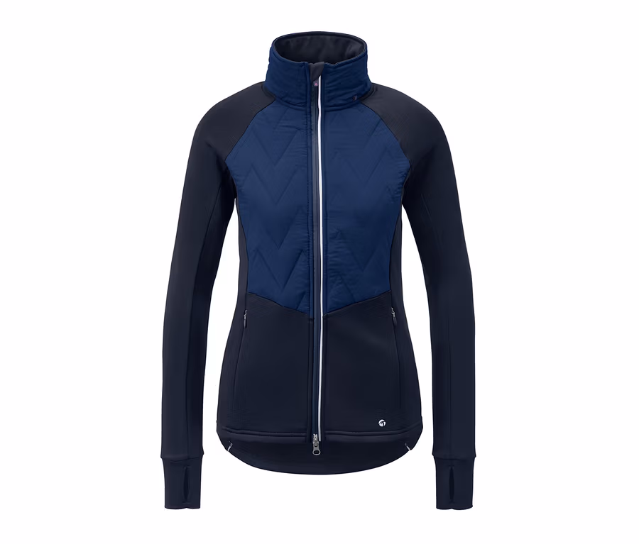 Zip je opatřen ochranou brady, zadní díl je mírně prodloužený a díky otvoru pro vedení kabelu od sluchátek lze i při tréninku pohodlně poslouchat hudbu. Na prsou a rovněž v horní části zad je klikaté prošívání, které zajišťuje obzvlášť módní look. Dvě boční kapsy na zip nabízejí prostor například na klíče. Konce rukávů s otvorem pro palec lze v případě potřeby přetáhnout přes ruce.