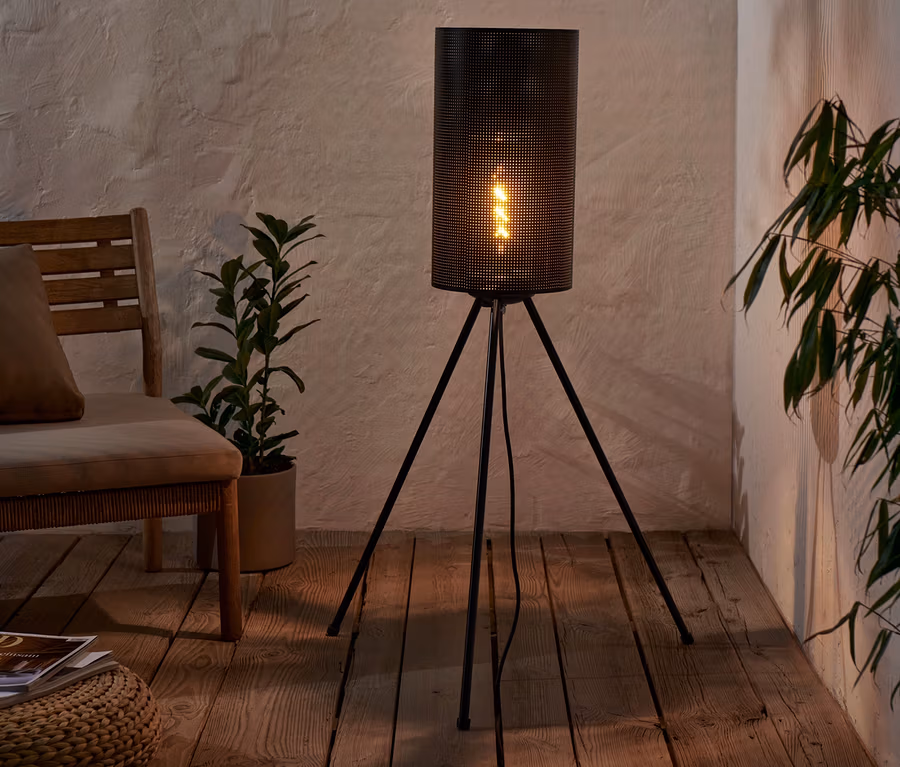 - Černá kovová stolní lampa ve stylu stativu – vhodná do exteriéru