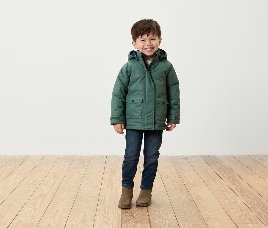 - Vnější bunda: přední zip s ochrannou klopou proti větru, velkým taháčkem a s ochranou brady