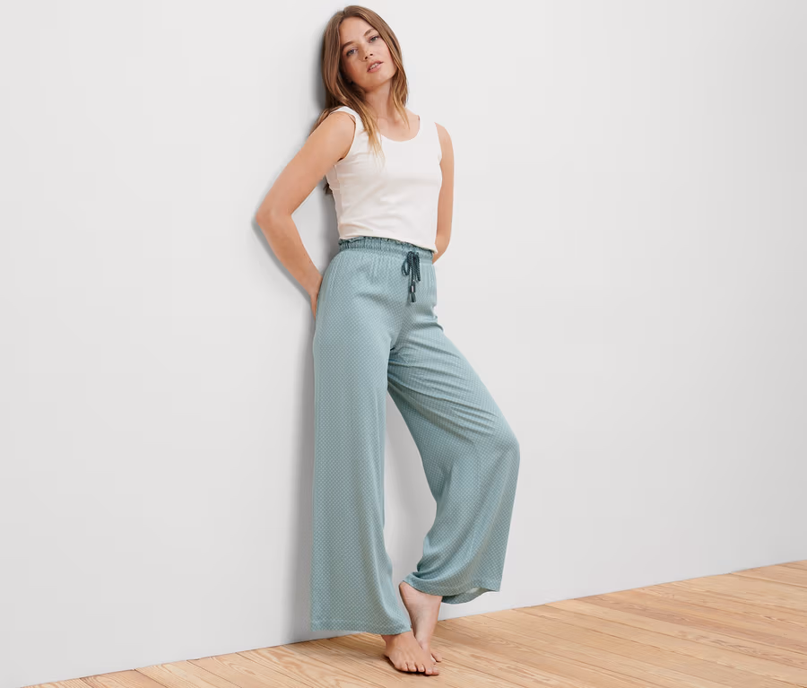 - Tyto pohodlné kalhoty obsahují vlákna z recyklovaného dřeva.