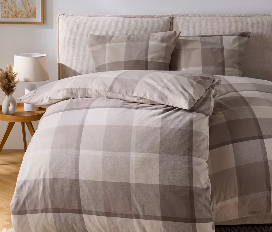 Flanelové povlečení, kostkovaný vzor v šedé a béžové barvě, standardní velikost