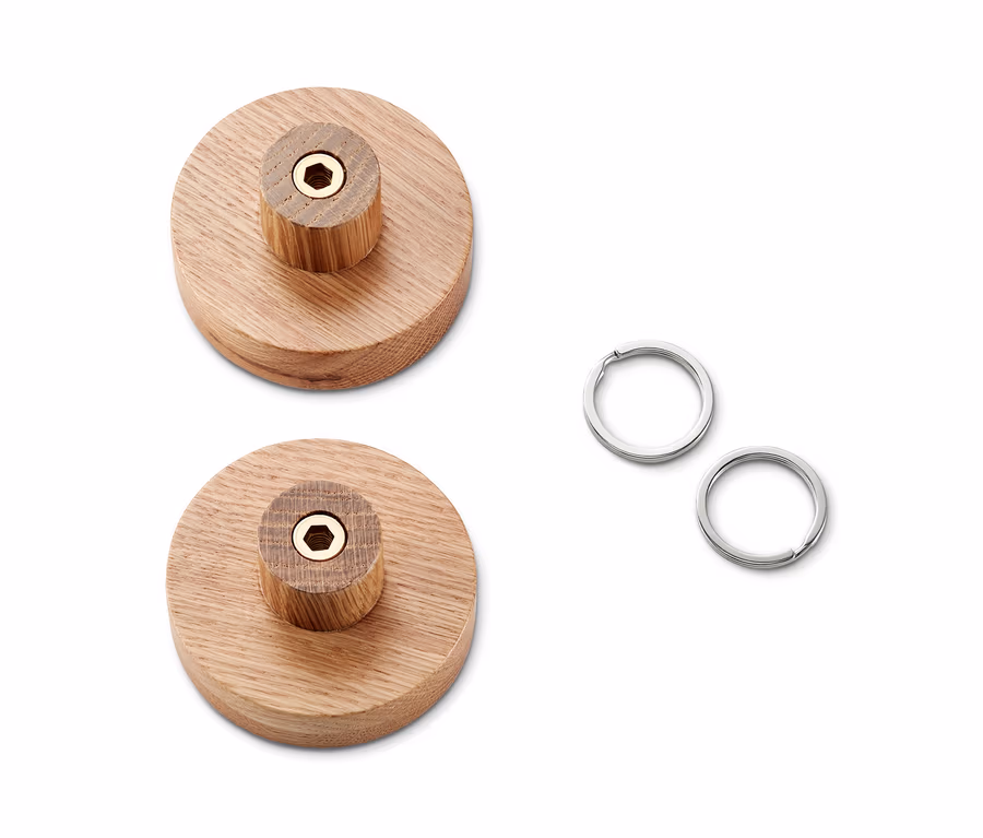Už žádné hledání klíčů: s těmito nástěnnými háčky z masivního dřeva bude mít vše své pevné místo. Na háčky lze pověsit bundy nebo kabelky a díky integrovaným magnetům lze připevnit i klíče nebo jiné magnetické předměty. Nosnost každého háčku je max. 5 kg, zatímco magnety udrží až 150 g, takže s pomocí malého magnetu můžete připevnit kromě klíčů také dopisy nebo pohlednice. Součástí balení jsou dva kroužky na klíče.