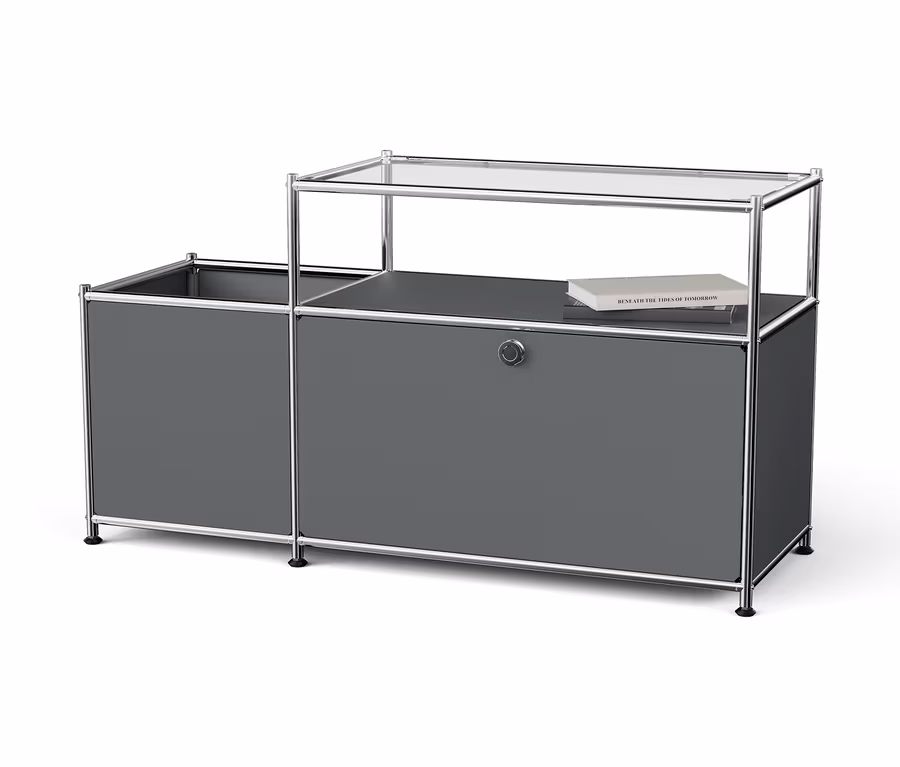 Nízká kovová skříňka »CN3« s výklopnými dvířky a skleněnou deskou, šedá