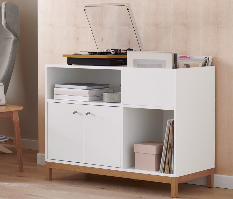 - Částečně otevřená komoda s ideálními rozměry na gramofonové desky