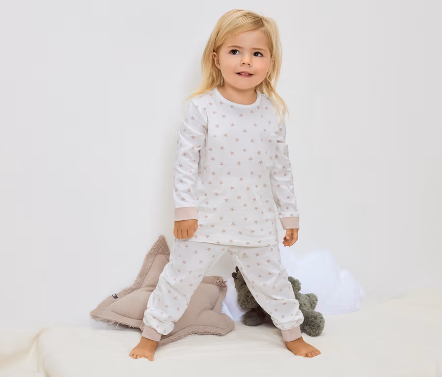 - 1x horní díl a kalhoty: bílá s celoplošným potiskem hvězdiček v pastelově růžové barvě