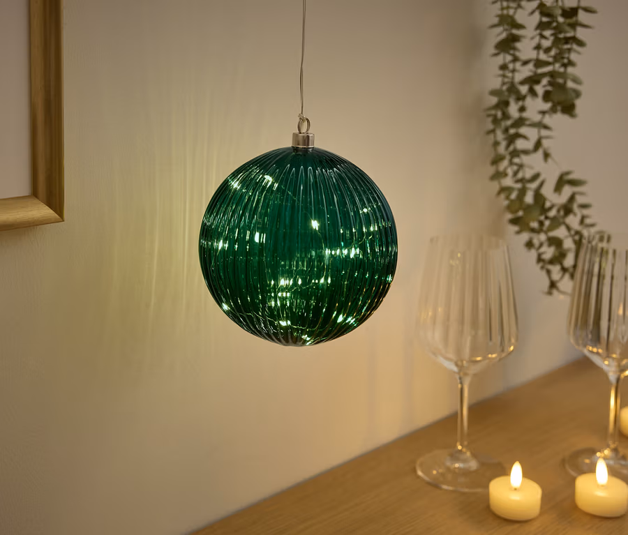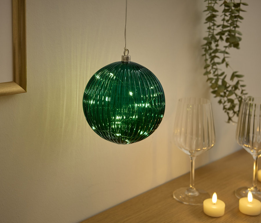 - Skleněné koule: zelená s prvkem v matně zlaté barvě