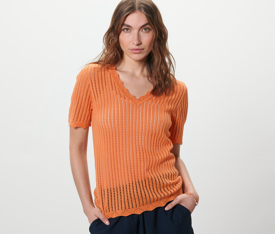 - Jedinečný pletený vzor vlnek u výstřihu, na koncích rukávů a dolním lemu