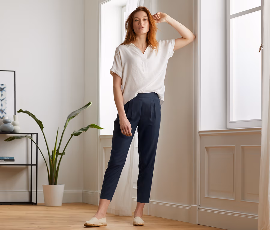 - Dámské kalhoty se 2 bočními šikmými kapsami vpředu a 2 ozdobnými zadními kapsami