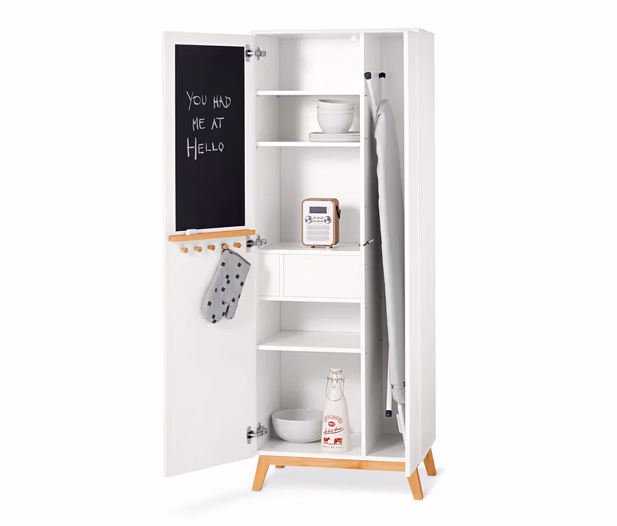 • Vnitřní strana dveří s křídovou tabulí, odkládací lištou a 5 háčky z masivního jasanového dřeva