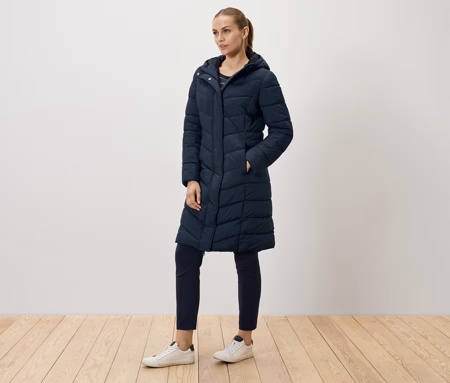 Prošívaný kabát s kapucí, tmavě modrá