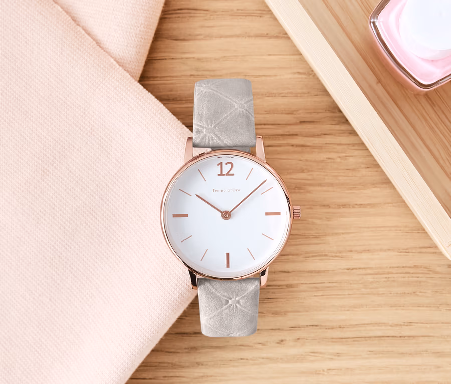 - Pouzdro: barva růžového zlata. Řemínek: šedá
