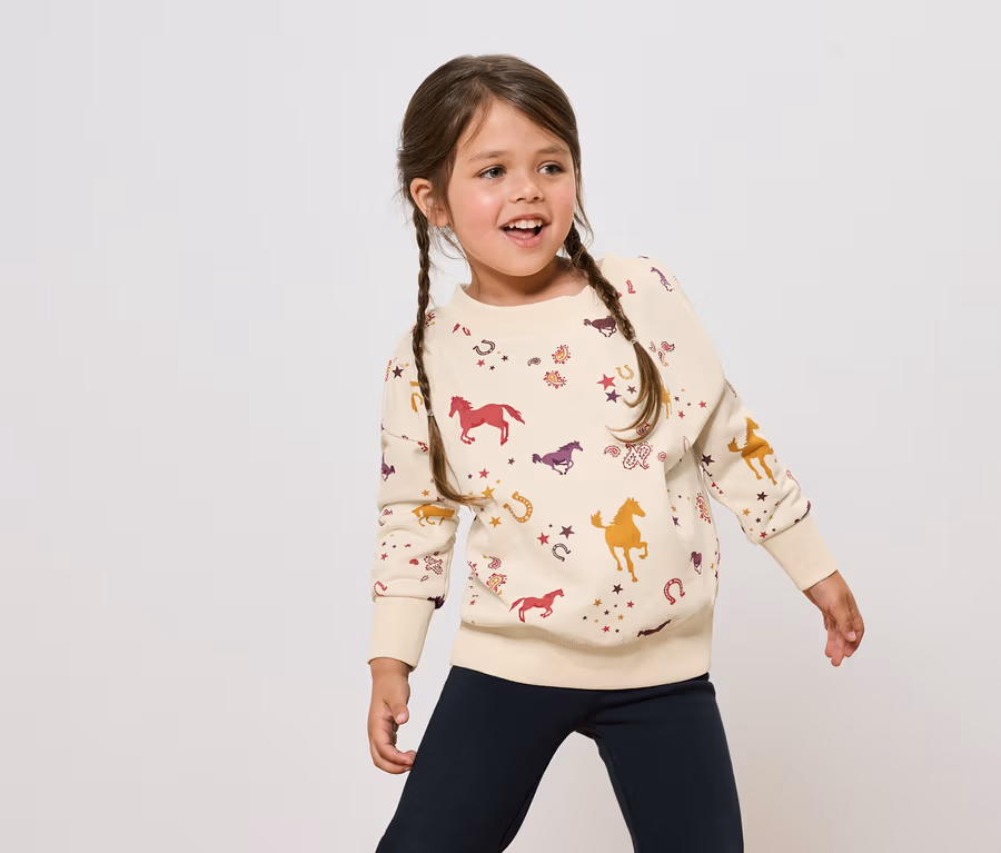 Dětská mikina s počesanou vnitřní stranou, celoplošný potisk koníčků
