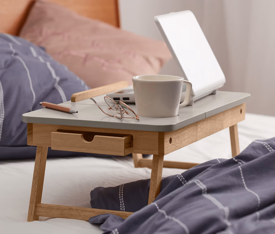 - Zarážka na desce stolku zabraňuje sklouznutí laptopu, tabletu, knihy apod.