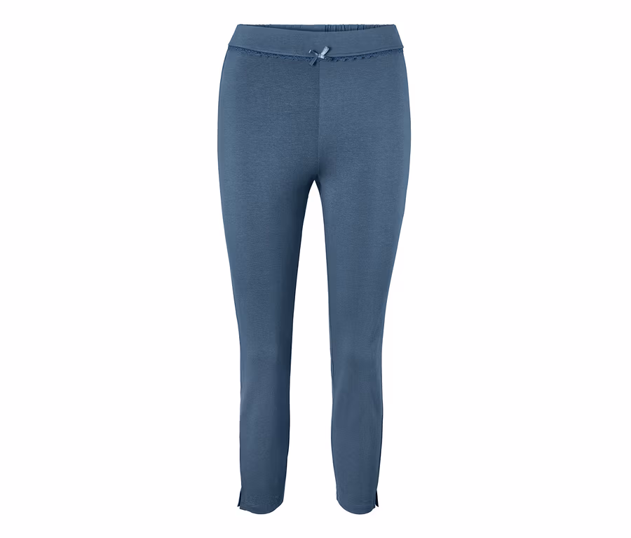 Čas na relaxaci! V těchto kouřově modrých pohodlných kalhotách půjde vše snadno. Příjemná směs biobavlny a modalu je příjemně jemná na tělo. Elastický pas kalhot s dekorativní krajkou a drobným krajkovým detailem není jen módní – zajišťuje, aby se kalhoty nezařezávaly v oblasti břicha. Dalším detailem jsou boční rozparky na nohavicích a podíl elastanu, díky kterému kalhoty perfektně sedí. Kdo potřebuje kalhoty na jogging, určitě ocení i možnost relaxace ve stylových kalhotách.