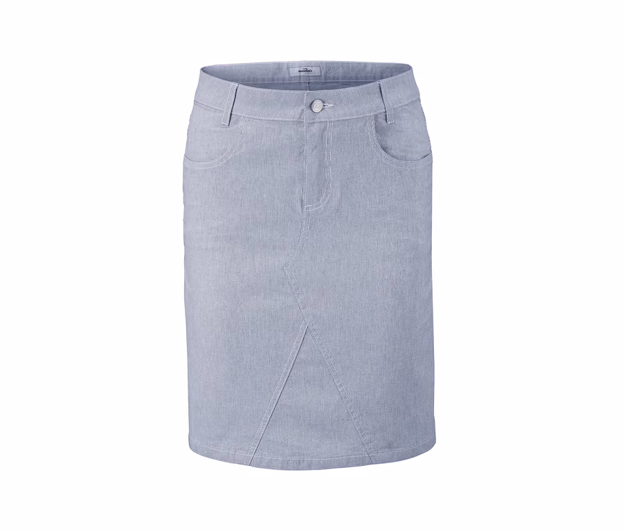 Strečová sukně má na přední straně dělicí švy, které podtrhují ženský střih, a na zadní straně rozparek pro optimální volnost pohybu. Sukně má dvě boční šikmé kapsy a dvě zadní kapsy a rovněž pas s poutky na opasek a se zapínáním na zip a na knoflík. Díky obsahu elastanu navíc dobře drží tvar a perfektně sedí.