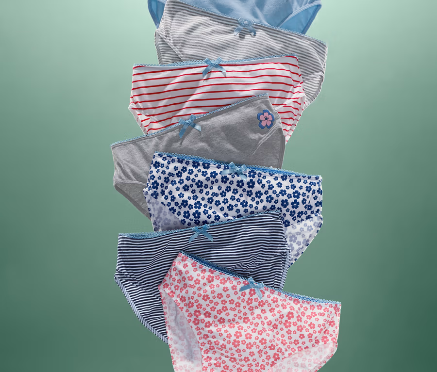 S těmito sedmery dívčími kalhotkami klasického střihu budou holčičky vybavené na celý týden. Kalhotky bodují z optického hlediska různorodými vzory. Kalhotky mají bavlněný klínek a elastický pas s ozdobným lemem a dekorativní mašličkou.
