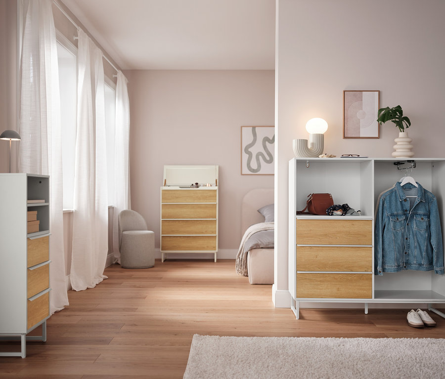 - Odkládací plocha, 1 otevřená přihrádka, 3 zásuvky s kovovými úchytkami a tichým dovíráním, výsuvná šatní tyč