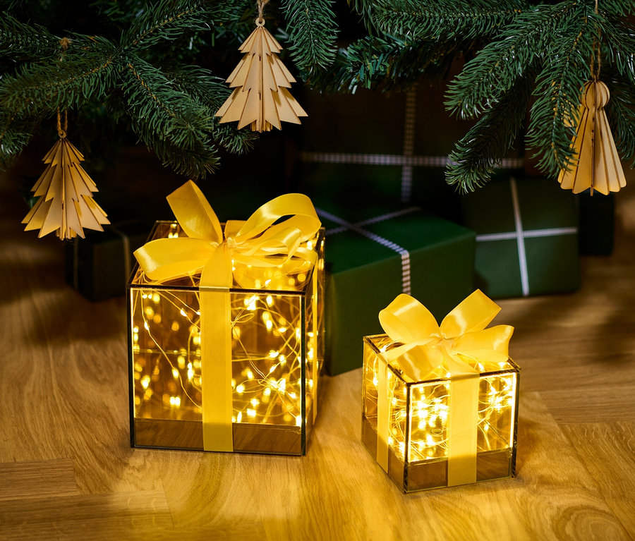 - 2 skleněné nádoby v dárkovém vzhledu s 1x 25 a 1x 15 LED – teplé bílé světlo