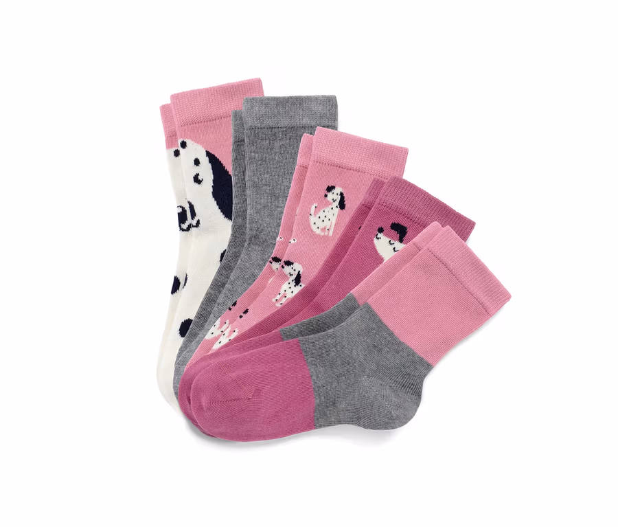 - 2x tmavě růžová s motivem pejsků, 1x bobulová s motivem pejska, 1x šedá s melírem, 1x s blokovými pruhy v šedé s melírem, tmavě růžové a bobulové barvě