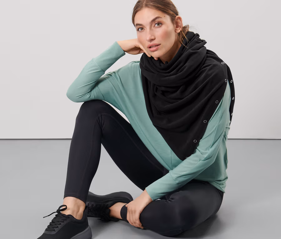 - Rozmanité možnosti nošení a použití: jako šála, čepice, malá dečka na jógu